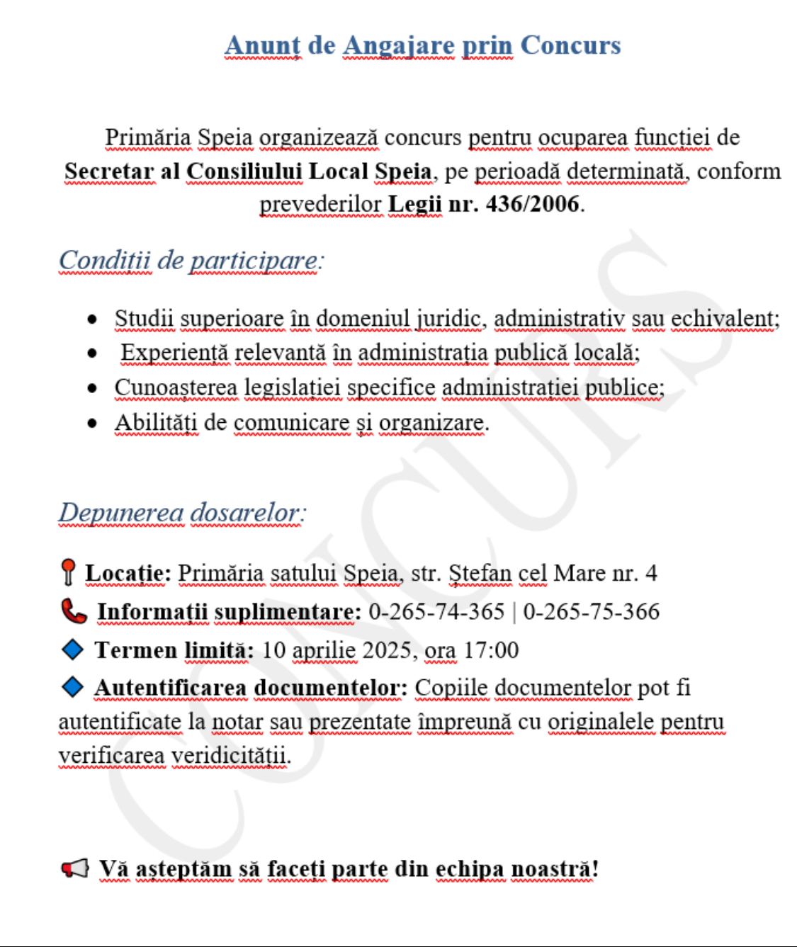 Loc de muncă Vacant Primăria Speia