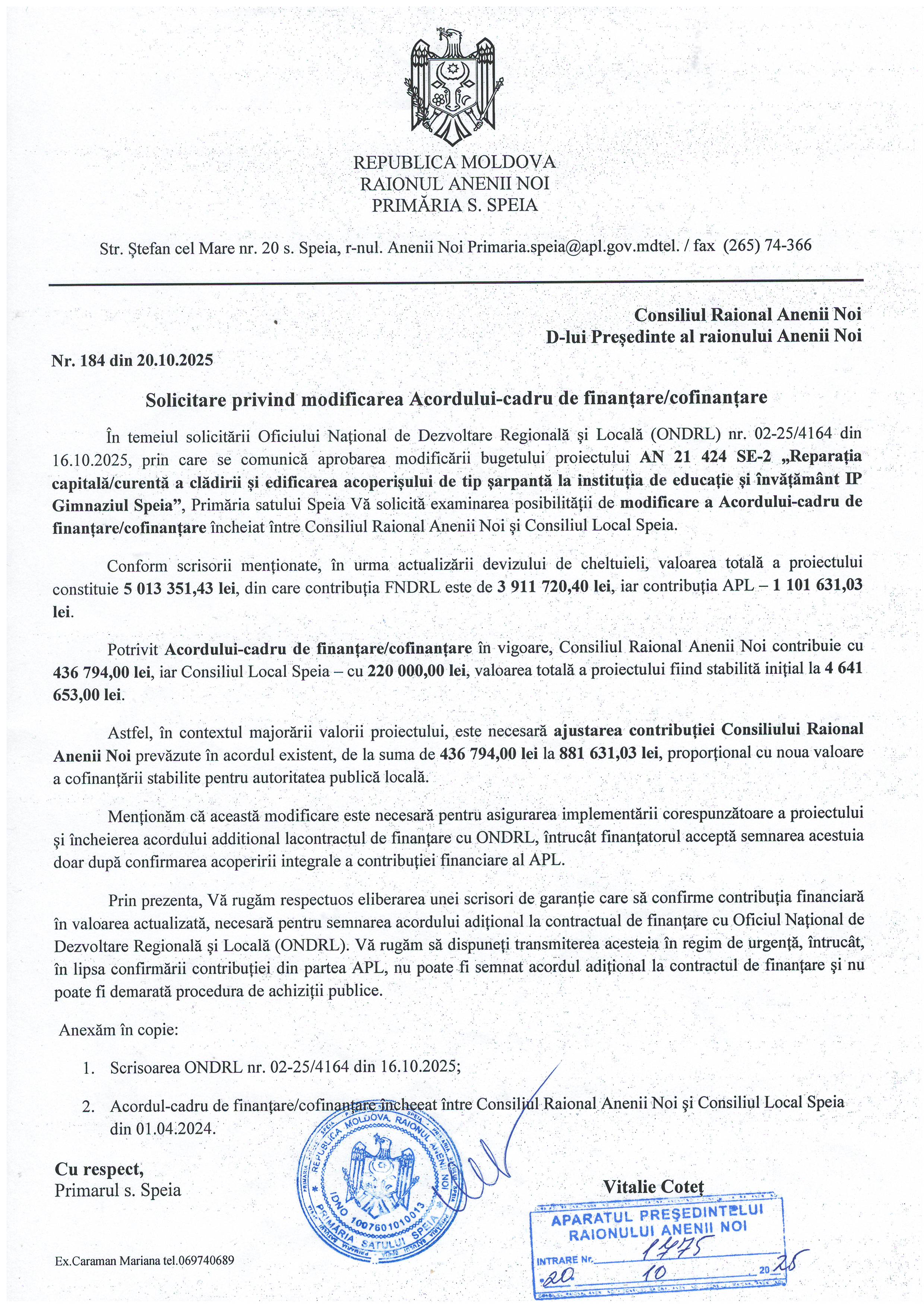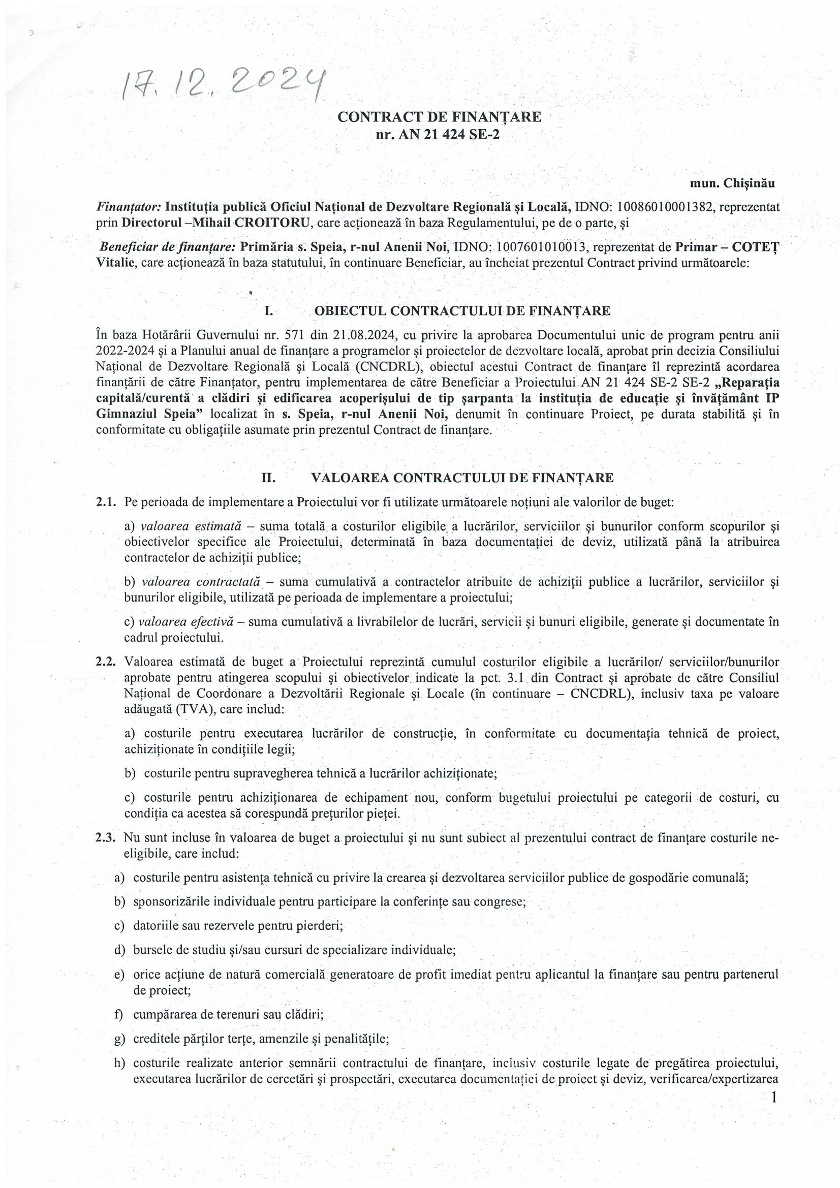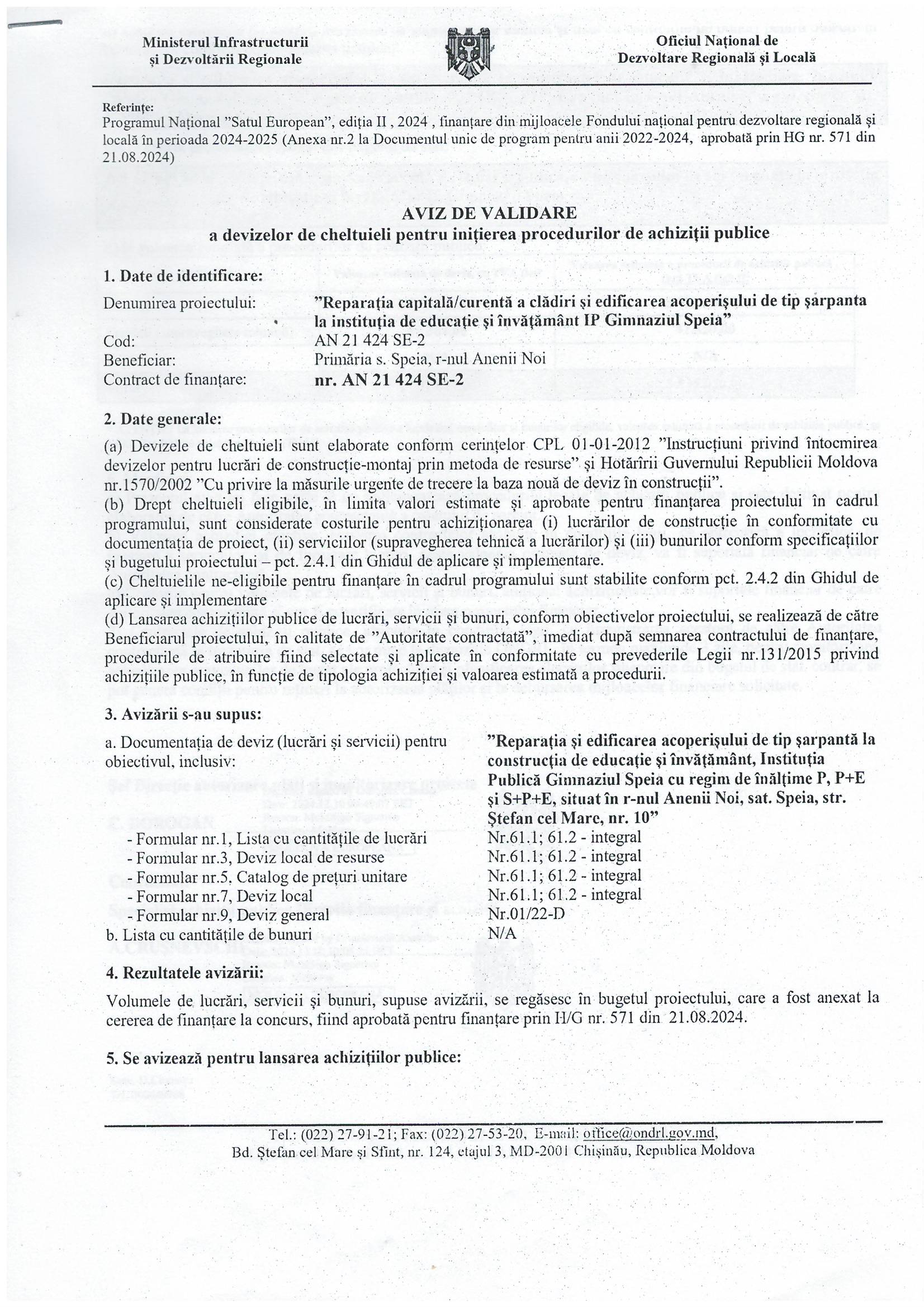Proiectul: Reparația capitală a clădirii și edificareaacoperișului de tipșarpantă la construcția de educație și învățămînt P, P+E și S+P+E , situat în r-nul Anenii Noi, sat Speia, str.Stefan cel Mare nr. 10