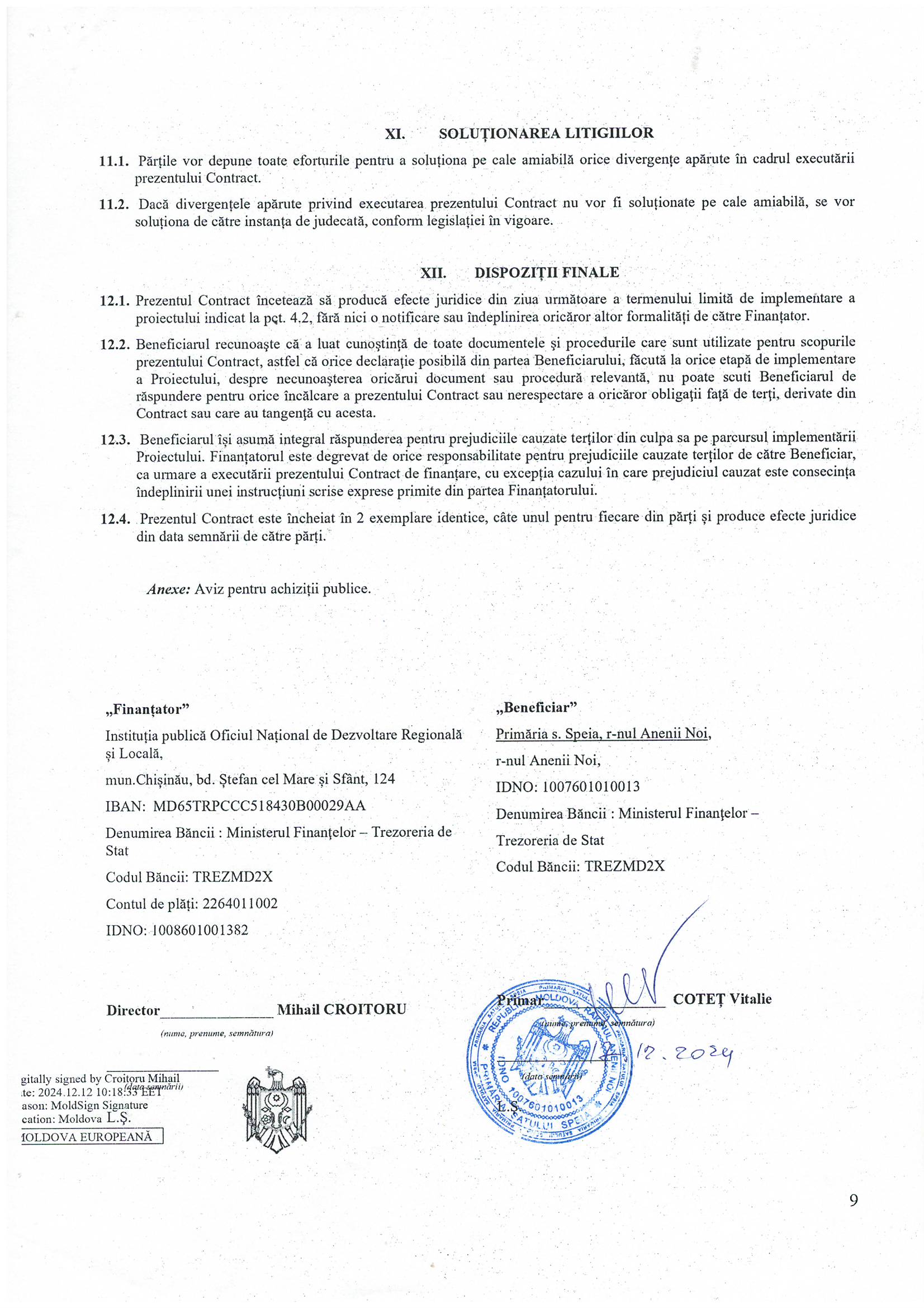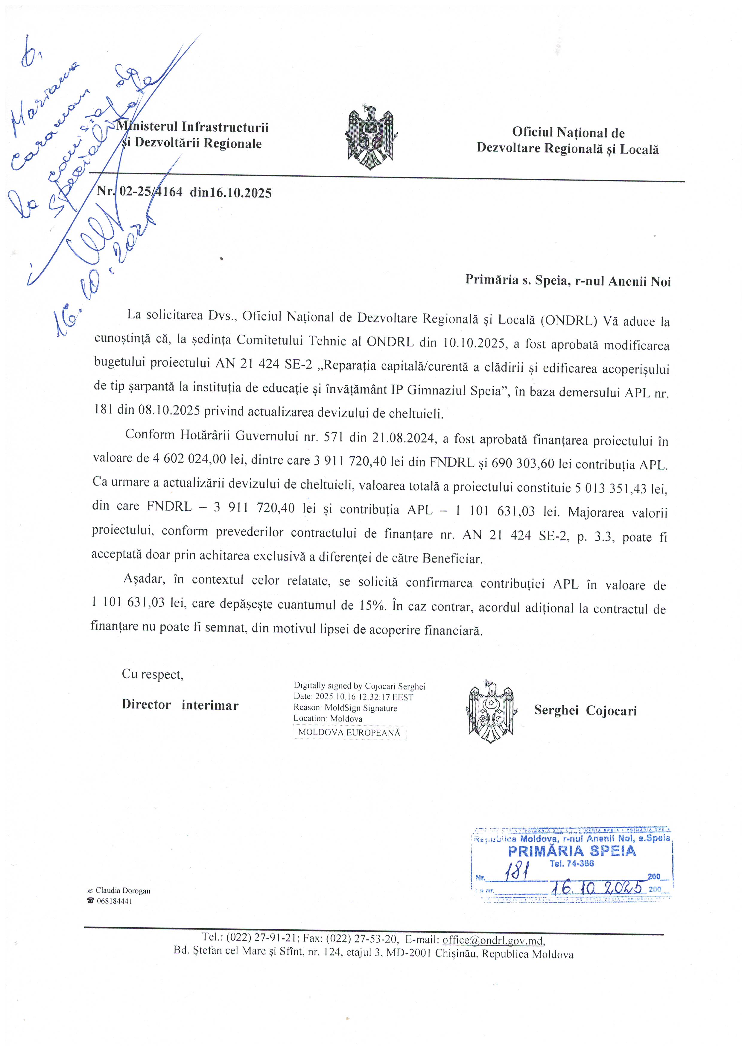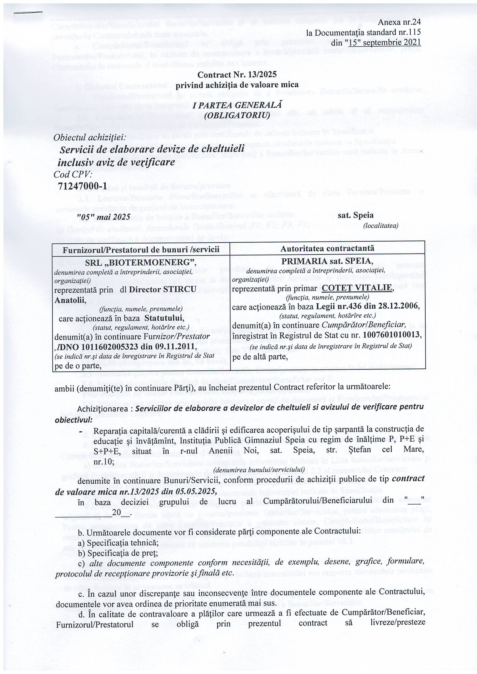 Proiectul: Reparația capitală a clădirii și edificareaacoperișului de tipșarpantă la construcția de educație și învățămînt P, P+E și S+P+E , situat în r-nul Anenii Noi, sat Speia, str.Stefan cel Mare nr. 10